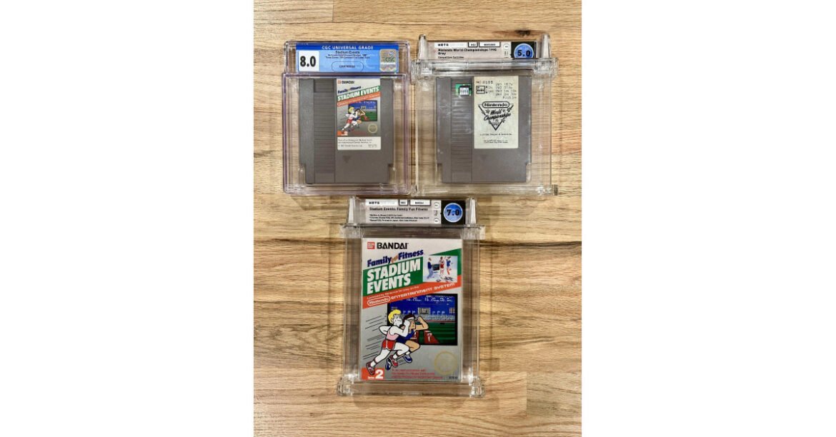 In addition to the Nintendo World Championship cartridge, M&M Video Games will proudly showcase two graded copies of the exceptionally rare Stadium Events game for the NES. Only a few thousand copies of the game were produced before Nintendo bought the rights and re-branded it as World Class Track Meet. While the latter would go on to sell millions of copies, the original was pulled from store shelves, with less than a dozen known to be in circulation today. In fact, the latest authenticated copy was sold at M&M Video Games earlier this year for more than $30,000.