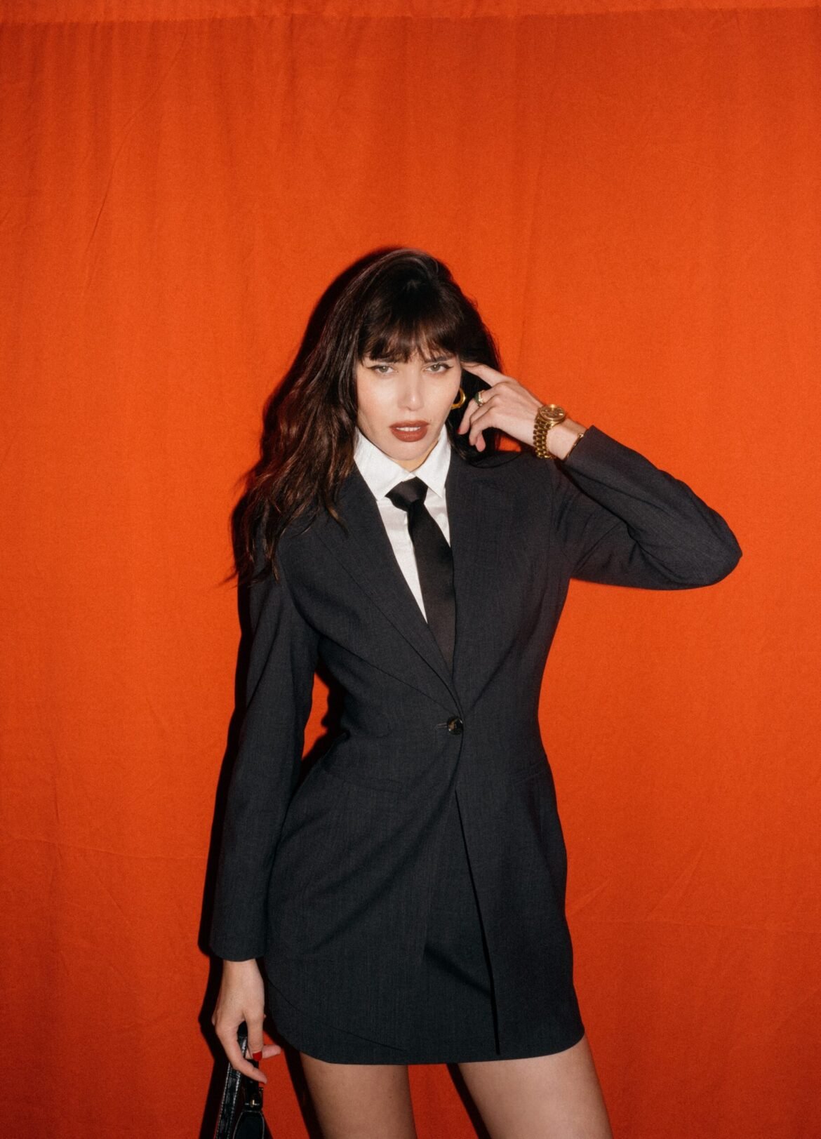 // Jimmy Choo loafers. Whistles blazer and skirt. Alice & Olivia shirt with tie. Demellier London handbag //