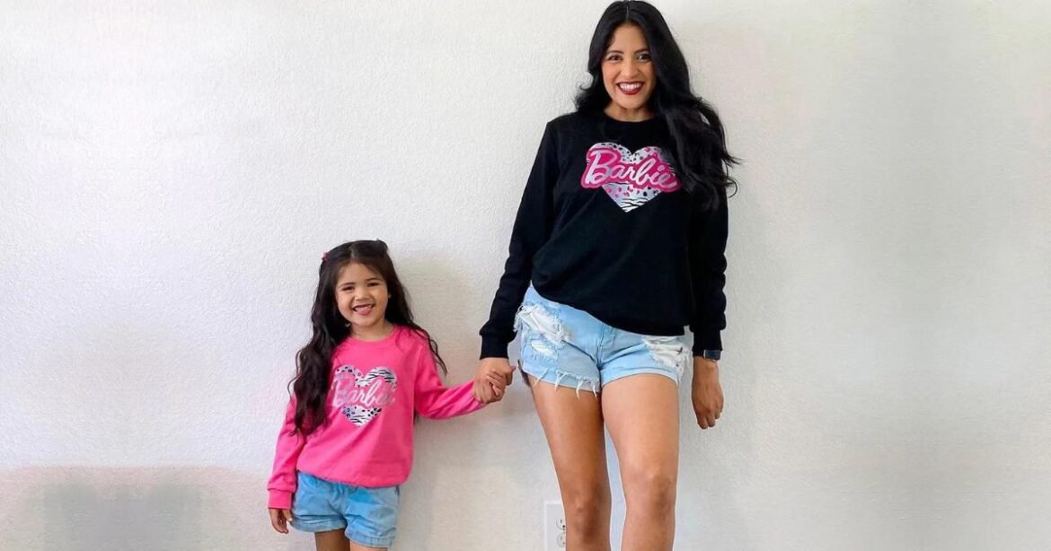 Mom and daughter wearing Mommy & Me Barbie bathing suits