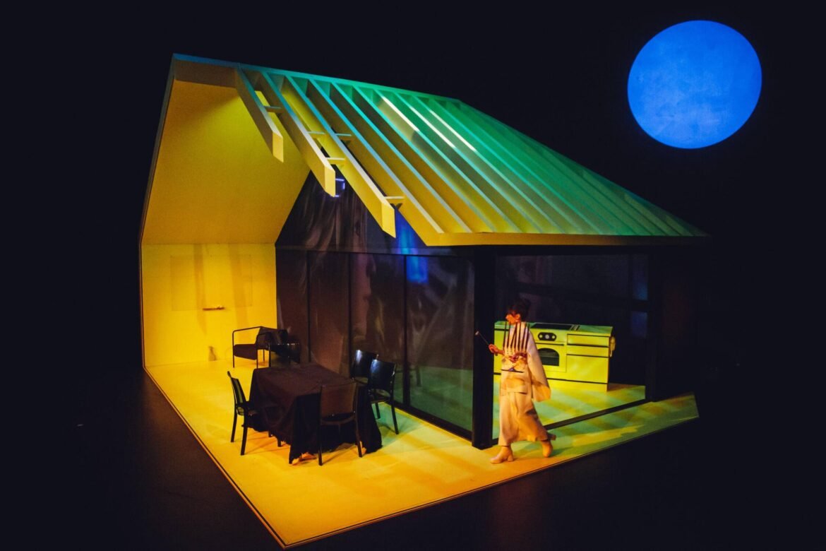 Alessio Meloni provides a playful set, a playhouse of sorts in black and yellow where the characters act out their roles. Gauze operates to separate out the discrete rooms where the characters seek refuge – Dunia in her upstairs studio; Delmira in the kitchen preparing Jewish dishes that never seem as good as they should. A screen on the wall of the house allows both the past and the wider present to intrude on the siblings’ life. There is footage of protests against the Uruguayan military regime in the 1970s, video interventions from the present from prominent dramatists, including the author playing a version of herself. Autofiction — fiction that draws on the author’s life — becomes not just an idea argued through by Darío and Dante but the genre of the piece itself.