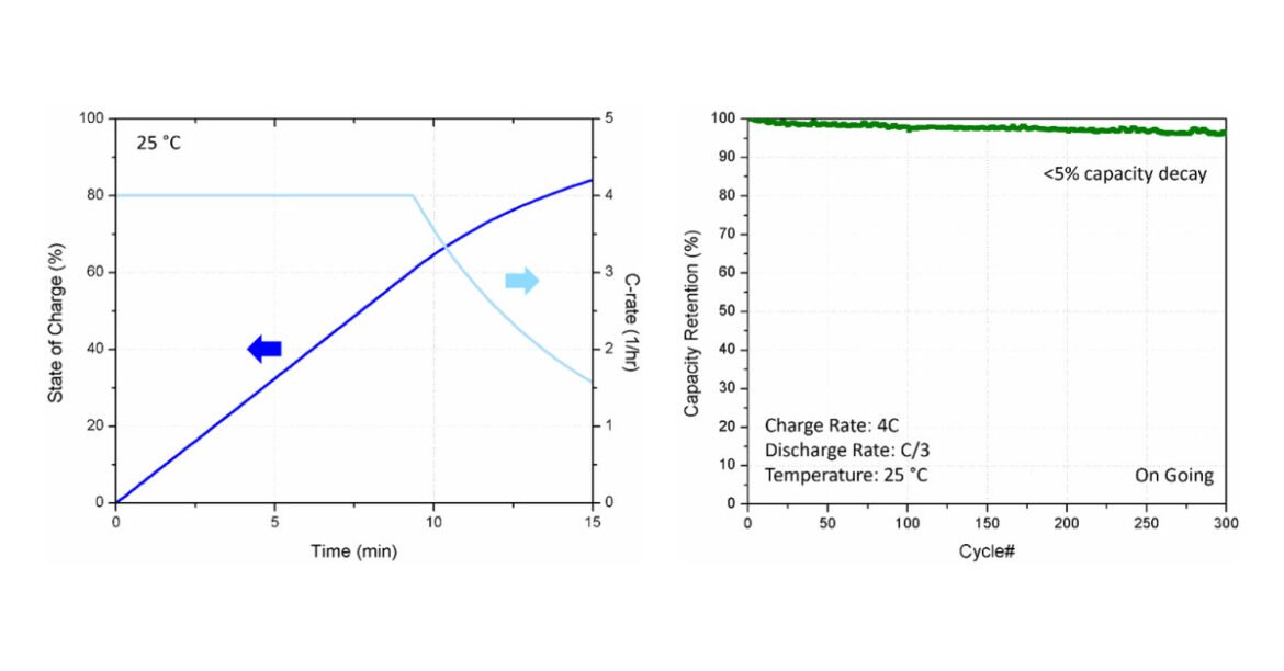 Ampcera Inc., a pioneer in solid-state electrolyte manufacturing and next-generation solid-state battery development, announces that its all-solid-state battery (ASSB) technology has achieved a fast-charging milestone of 0 to 80% state of charge (SOC) in under 15 minutes at a peak C-rate of 4C. This advancement demonstrates the fast-charging potential of ASSB – a key requirement for the widespread adoption of electric vehicles (EVs).
