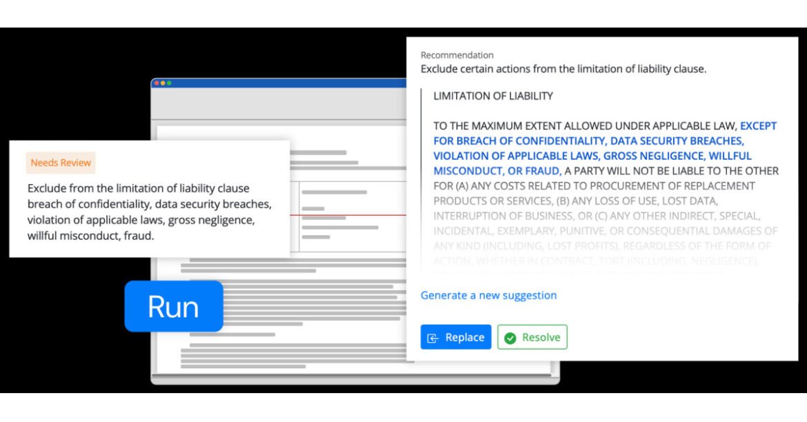 - Review: Accelerates contract review by checking your contracts against predefined rules and playbooks. AI Contract Assist comes pre-loaded with five industry standard playbooks for common contract types, which can be easily edited, or new rules can be added from scratch. AI Contract Assist flags contract language that needs your attention and suggests redlines to bring it back into compliance.