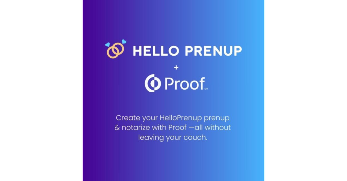HelloPrenup & Proof have joined forces to bring convenient, accessible solutions to everyday couples across the country. Their new premier, exclusive offering includes an unprecedented prenup package, including e-signing & notarizing their HelloPrenup prenuptial agreements online.