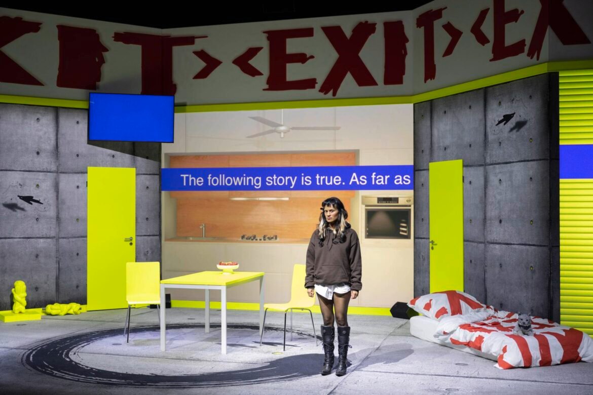 The piece gives very little information on what Angela thinks: motivation is non-existent, exposition minimal. Her transformation is realised through changes of movement, the body increasingly disconnected from the demands the mind makes of it. The room has a strangeness about it that matches Angela’s strangeness; its design has more in common with a video game than a proscenium arch design with its projections and lettering. EXIT features prominently on a banner at the top of the room. Angela’s rumpled bed remains stage left. Fluorescent lime green doors match the minimalist table and chairs. It looks like a showroom rather than a lived environment. Screens show Angela’s soft toy — a strange bear-cum-cat that speaks — and a series of messages projected that alert an audience to the piece’s structure in three parts. But as with much in Kennedy’s theatre, this not a message that can be taken literally. The projections give announcements that should not always be believed. The following story is true as as far as I know, the captions inform the audience, but what is truth in a post-human world? Whose truth are we subject to? Who is defining truth? Information overload is often a feature of the piece. How do we navigate our way through it?