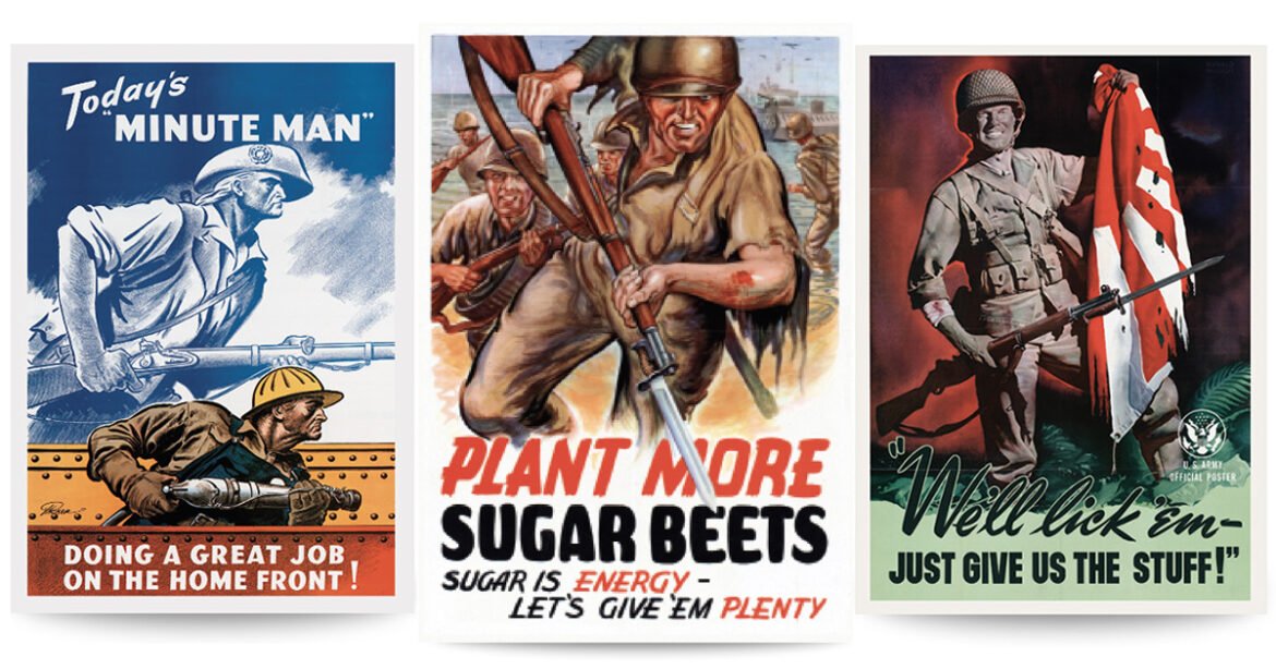 If you had any doubt about what you should be doing—or not doing—as an American to help the war effort, there was probably a poster that could point you in the right direction. Should you buy war bonds? (The answer was emphatically yes.) How about driving to work by yourself? (No! “When you ride ALONE you ride with Hitler!”) If you were a farmer, what should you produce? (Corn! Sugar beets! Milk!) Was it okay to chat about your work with that affable stranger at the bar? (Absolutely not! “Loose talk can cost lives.”) Colorfully eye-catching, the posters exhorted Americans to work harder, produce more war materiel, save gasoline and scrap metal, support their soldiers and sailors, and stop complaining about shortages. In one poster titled “Of course I can,” a young woman clutches her home-jarred food and says, “I’m patriotic as can be—And ration points won’t worry me!” (One thing that did not appear to be in short supply during the war was exclamation points.)
