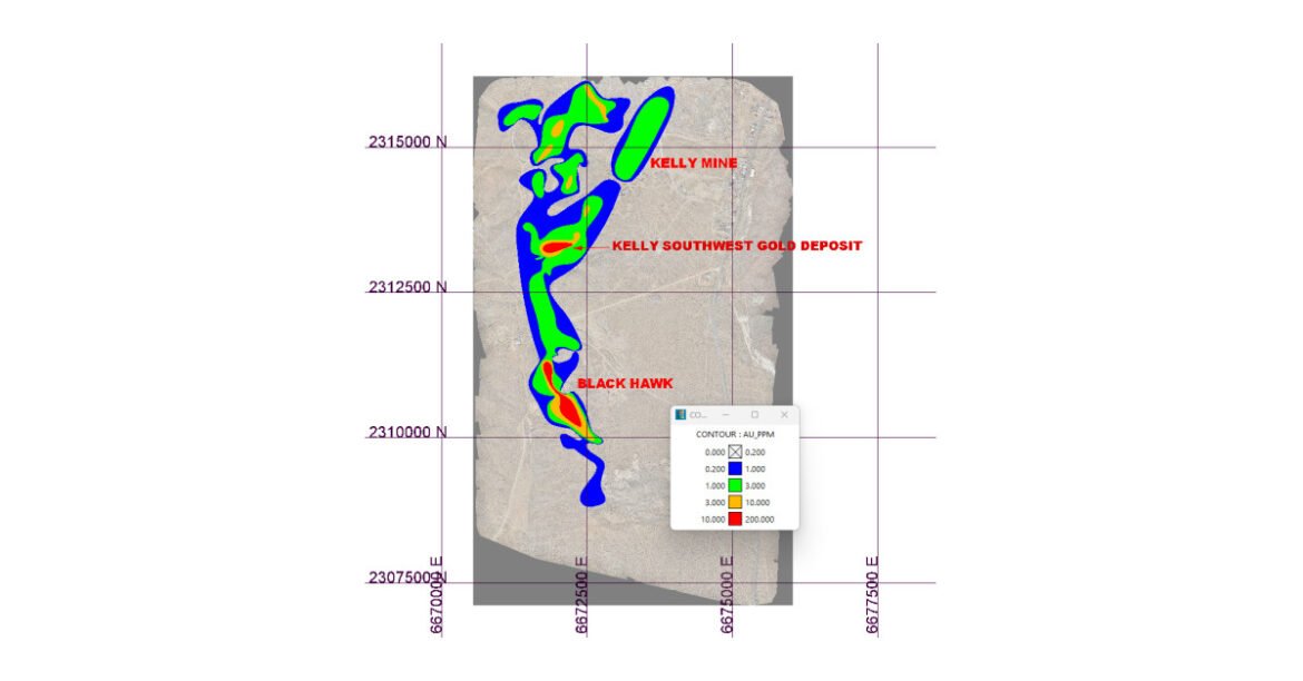 “The surface sampling program has confirmed a large area of anomalous gold mineralization exists,” said Sam Shoemaker of John T. Boyd Company and project manager for B&N Mining. Noting the potential of this discovery, he added, “This has the potential to extend the Kelly Southwest Gold Deposit to the west and north while the anomaly at Black Hawk is very exciting given the higher gold grades encountered in the outcrops on the ridge.”
