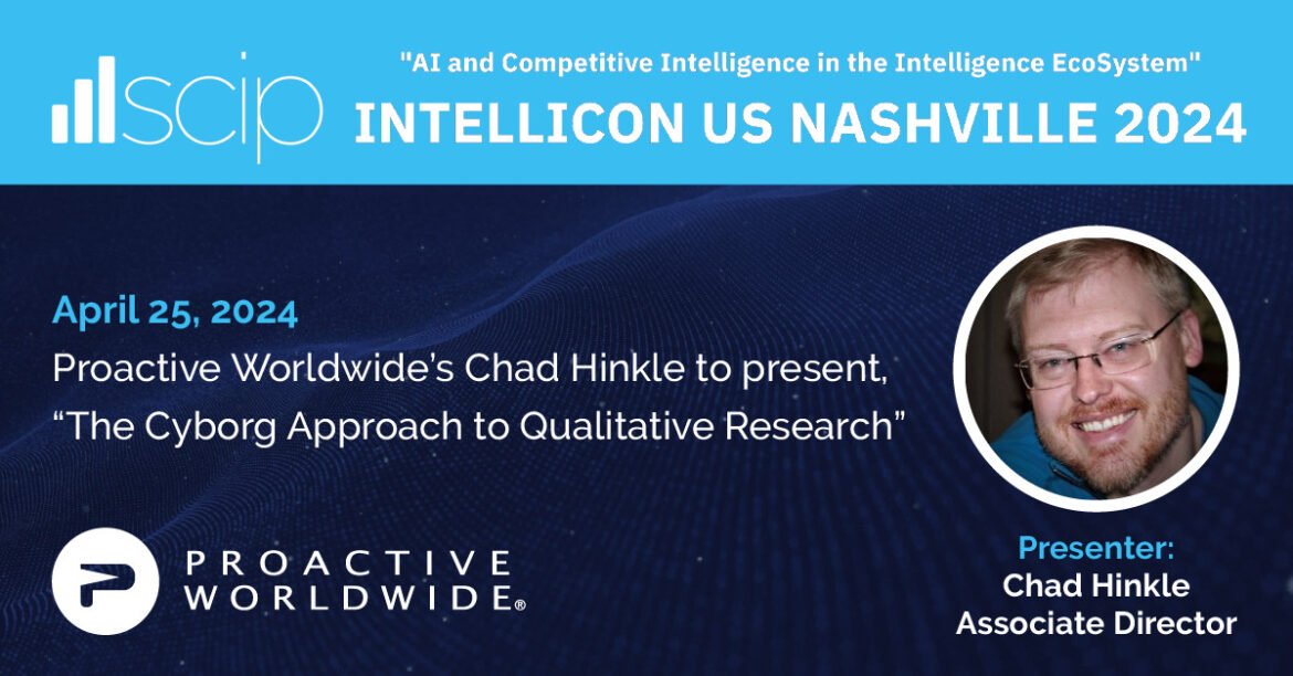 Proactive Worldwide is proud to announce that Chad Hinkle, Associate Director, B2B Voice of Customer, will lead a pioneering session at SCIP Intellicon US 2024 in Nashville, titled “The Cyborg Approach to Qualitative Research,” on Thursday, April 25, 2024.