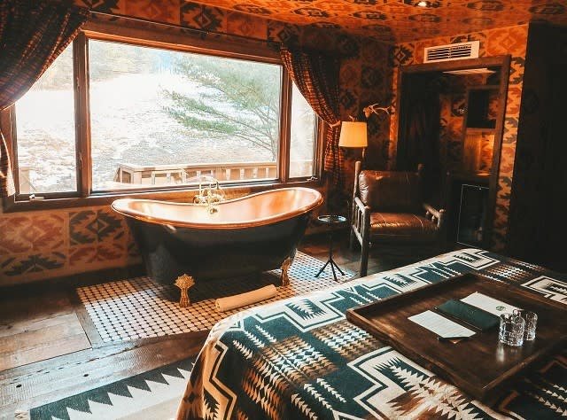 Nestled along the Big Indian Wilderness, this boutique mountain lodge puts a trendy yet stunning take on staying in the Catskills through their uniquely-themed guest rooms spread across five buildings. The Alpine holds suites adorned with signature clawfoot tubs, cast iron stoves providing warmth and coziness, and private decks with valley and forest views. The Chalet wows not only with wood-paneled cathedral ceilings and large picture windows in every room, but also an oversized bedroom, full kitchen, and private deck with a Japanese soaking tub for two. Dinner at the lodge’s Public House centers on a menu that’s seasonal, veg-forward, and locally sourced. Head out for dinner at Peekamoose Restaurant, housed inside a former farmhouse. Their upscale American menu features wood-grilled octopus and oven roasted Atlantic cod that are always a hit. Make an appointment for two at Emerson Spa in Mount Tremper, for a “Couples VIP Soak and Massage” ($475 per couple) paired with truffles and prosecco.