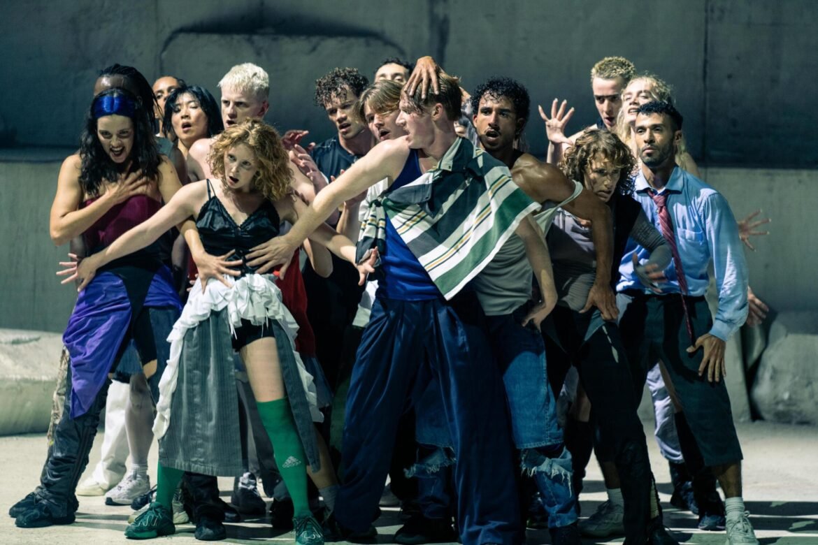 On the website of Dance Reflections, a generous funding and support program patronized by the French luxury jewelry brand Van Cleef & Arpels that supports a selected number of dance artists, the blurb for Room with a View states the intent to explore protest and rebellion through dance. It also stresses, from the first sentence, that the (initial) collective of twenty-five dancers number sixteen different nationalities. On stage, however, as a product of the same internet culture and the imperialism of neoliberal globalization ruled by powerful giant corporations in tech, oil, finance, fashion, entertainment, pharma, or weapons manufacture, these dancers perform middle-class characters uniformized in looks and homogenized in lifestyles and desires. They all dance in the same way to the same music and idolize the same DJ. They chase the same thrills of hooking up. In the first parts of the show, they woo each other in mating rituals involving couples or threesomes. Their sex and gender fluidity and open-mindedness to experimentation promise a potential to refashion aspects of the social world, if only they could be brought to think beyond the private sphere of immediate satisfaction. A major deterrent to do so suggested by the production is the desolate state of the surroundings. The grey, concrete scenography channels an urban space fallen into decay. At times, dust and particles fall from above, implying both crumbling buildings and pollution. At one point, dozens of fish suddenly drop from the sky, their bodies still excruciatingly flapping as they are being swept away by people in hazmat suits. I had to be reassured repeatedly by a colleague that the fish weren’t real, that they were these flapping contraptions popular on TikTok. In the context of this world, the characters’ hot yearnings for connection underneath a cool hookup culture get tainted by fear and alienation and catch fire into burning, brutal violent acts. Partners abuse and mistreat each other, culminating in a rooftop scene of horrid anal fisting and head smashing against a rock.