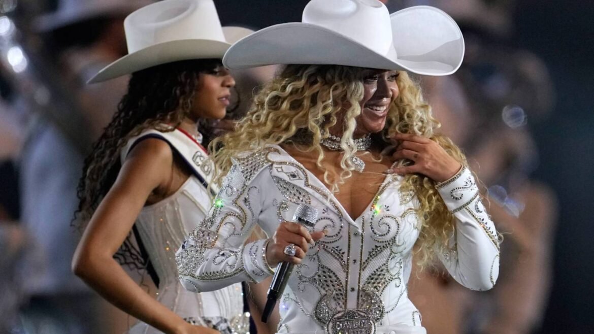 The star also delivered electrifying performances of “Ya Ya” and “Riverdance,” before being joined by Shaboozey for their collaboration, “Sweet Honey Buckiin’” and Post Malone for “Levii’s Jeans” — denim-covered truck included. After belting out “Jolene,” her take on the 1973 Dolly Parton song of the same name, Beyoncé performed “Texas Hold ‘Em” for the first time, while declaring: “It’s only right that we do ‘Texas Hold ‘Em’ for the first time in Texas.” Her daughter, Blue Ivy, took her mother’s side for the celebratory moment, wearing a Cowboy Carter sash.