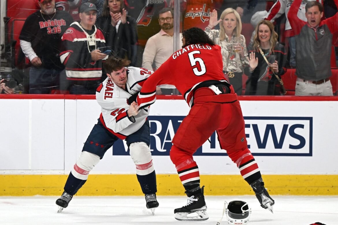 The two players dropped gloves in the third period of Carolina’s 5-1 win. With both losing their helmets early in the scrap, Chatfield took McMichael down forcefully to the ice in a wrestling-style slam.