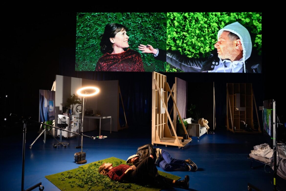 There is a big screen hanging above the stage on which four faces in four individual frames are apparently chatting to each other as we walk in. At the same time two other persons are busying themselves in a somewhat deconstructed space in front of us where this show will be assembled in the subsequent hour and 40 minutes. Though the first association might be a throwback to the life during the covid-19 pandemic, we are quickly reassured that ‘this is different’. It aims instead for an exploration of the idea of the ‘global village’ – famously attributed to Marshall McLuhan in the 1960s when the concept was still predicated on the then analogue technological development. Now, digitally-enabled, this global village is quickly accelerating to well over 8,2 billion inhabitants – the actual number is monitored live in the course of the show and displayed on a digital panel.