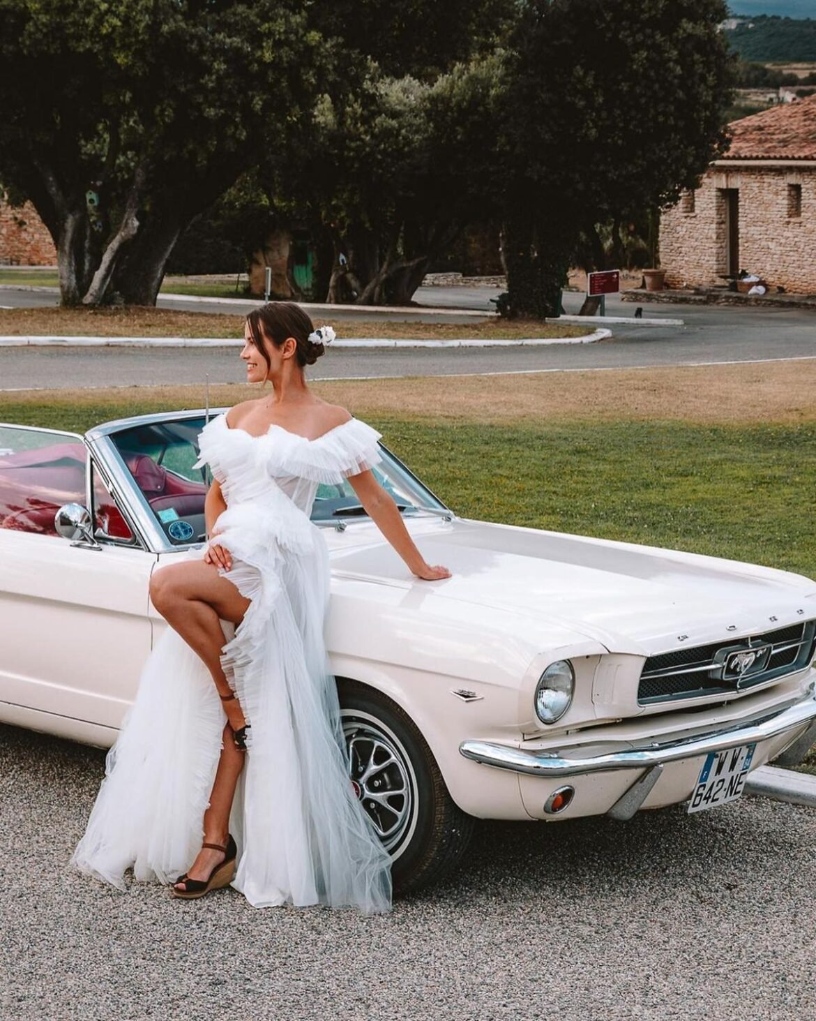 - Works for: Brides who want a fun, vintage vibe or don’t want to fuss with a full train.