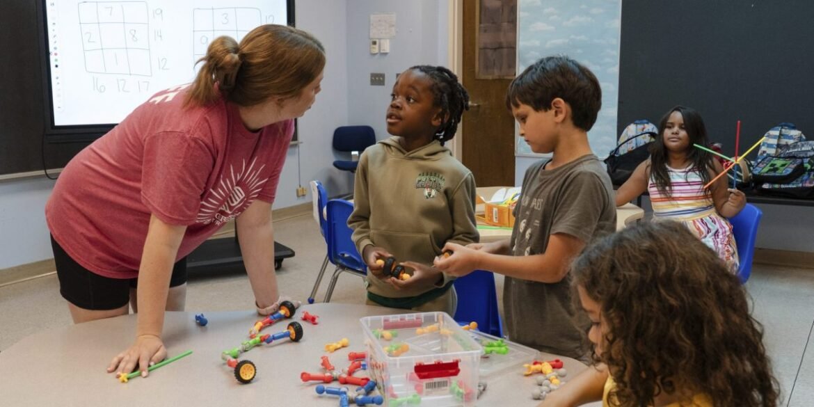 At the East Providence summer camp, Aiden, a rising third grader, played tag, built structures with magnetic tiles, played a fast-paced game with the other kids to review addition and subtraction, learned about pollination, watched a nature video and ate club-provided chicken nuggets.
