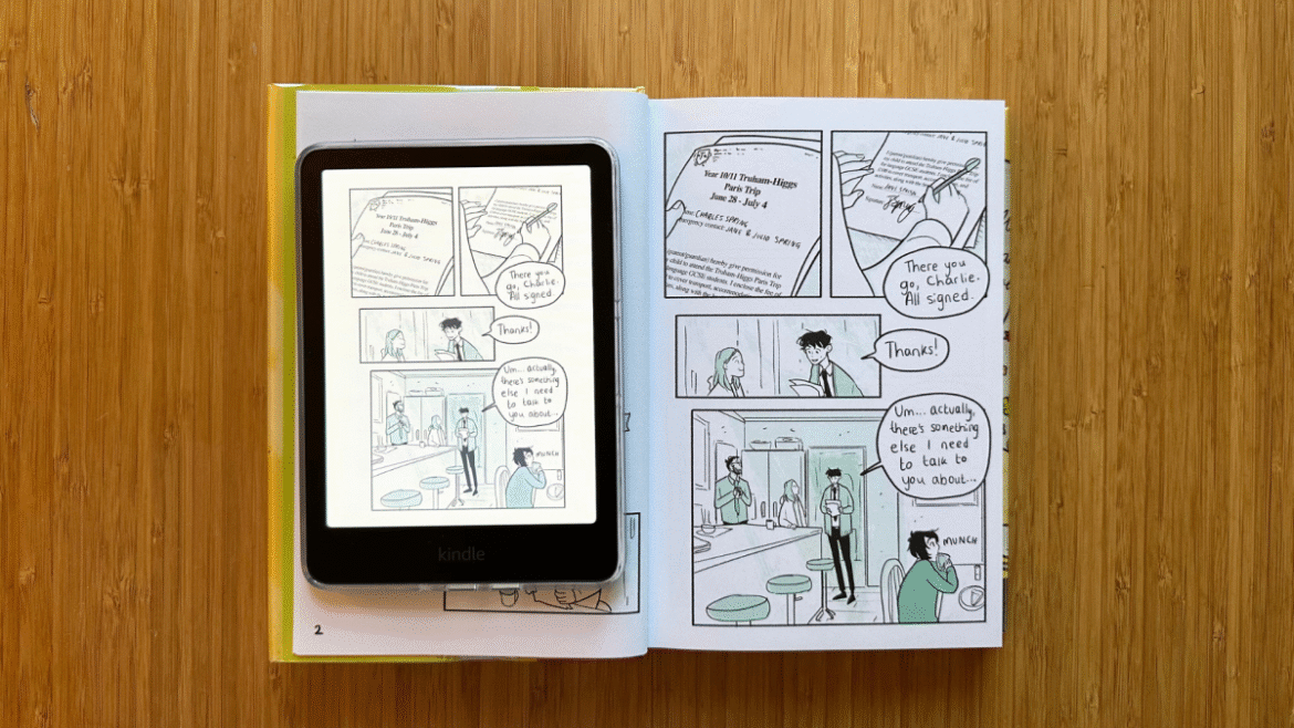 I borrowed a copy of Heartstopper Volume 3 with Libby and sent it to the Kindle Colorsoft, but I wanted to see how it actually compared to the real thing. After grabbing a physical copy of the novel from the library, I set them side-by-side to see how the visuals compared.