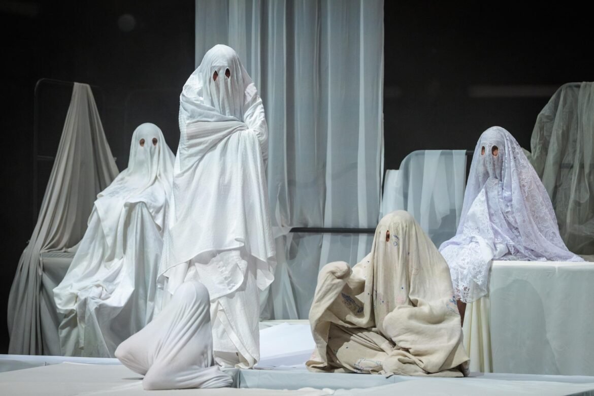 Therapy as an artistic tool is also used in The Ghost Enters by Weronika Szczawińska. The starting point for creating the script was a scene in which Hamlet meets the ghost of his father. Of course, the ghost reveals the truth of his death and obliges his son to take revenge. Szczawińska and the cast widen the frame of the ‘meeting your father situation’ and they let the ghost of the father speak out. Actors disguised with bedsheets with the eye holes evoke the ghosts to confront them or let them speak. Later scenes refer to toxic, silent fathers, or those helpless with bringing up children, fathers lecturing and blaming everyone for their failures, but also – theatrical fathers – authorities we used to look up to, admire or had been compared with. The show is far from a diagnosis, rather opening a (humorous) space to invite our own father ghosts.
