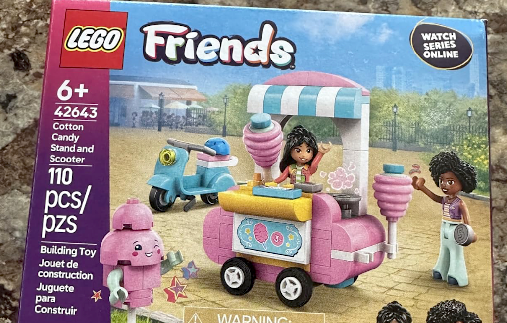 girl playing with LEGO Friends Cotton Candy Stand and Scooter set
