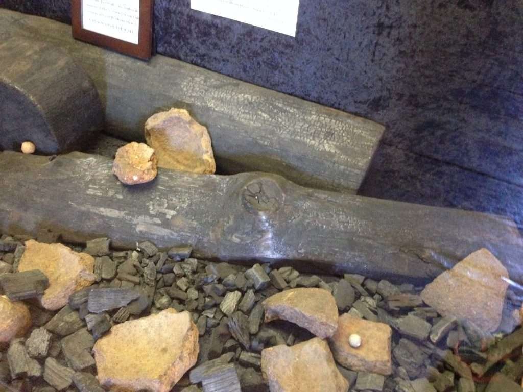 Illustrations, from above: Photograph of an exhibit case at Fort William Henry Museum shows what are reported to be a couple of burned timbers reputedly excavated from the 1755–1757 British fortification (courtesy Joseph W. Zarzynski); and a replica cannon along the Northwest bastion of replica Fort William Henry in Lake George Village (Joseph W. Zarzynski).