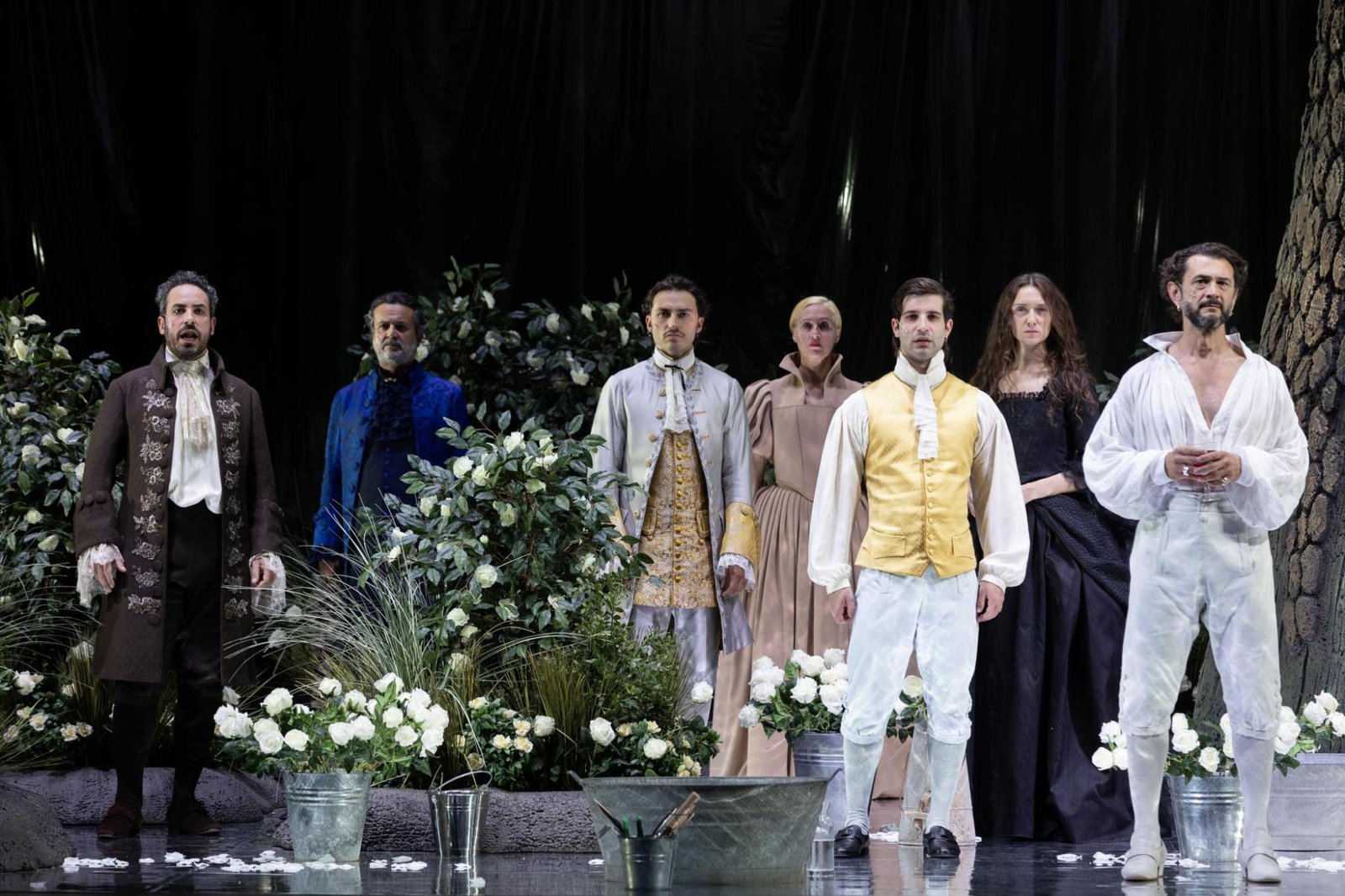 The set and Richard’s appearance reflect director Antonio Latella’s concept of evil, which resides, “in beauty, not in disharmony. Evil is the garden of Eden.” (a program note) Far from more traditional interpretations of the protagonist, as a dark, disabled Machiavel, Latella’s conception comes close to recent interpretations of the King, such as Jonjo O’Neill’s Richard at the Royal Shakespeare Company during the World Shakespeare Festival in 2018, or the 2024 award-winning production at Belfast’s Lyric Theatre, starring an, at times, clownish Michael Patrick.