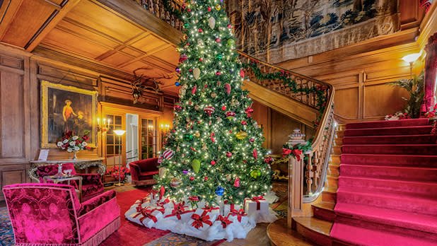 Lavishly decorated room with a large Christmas tree, red carpeted stairs, ornate wooden paneling, and elegant furniture at the Staatsburgh State Historic Site.