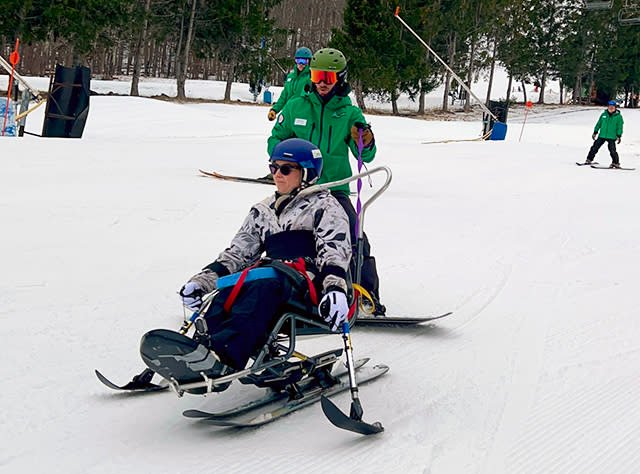 Nikki Walsh of Adapt Fit using adaptive skiing equipment on a snowy slope at Windham Mountain Club, assisted by an Adaptive Sports Foundation instructor in green.