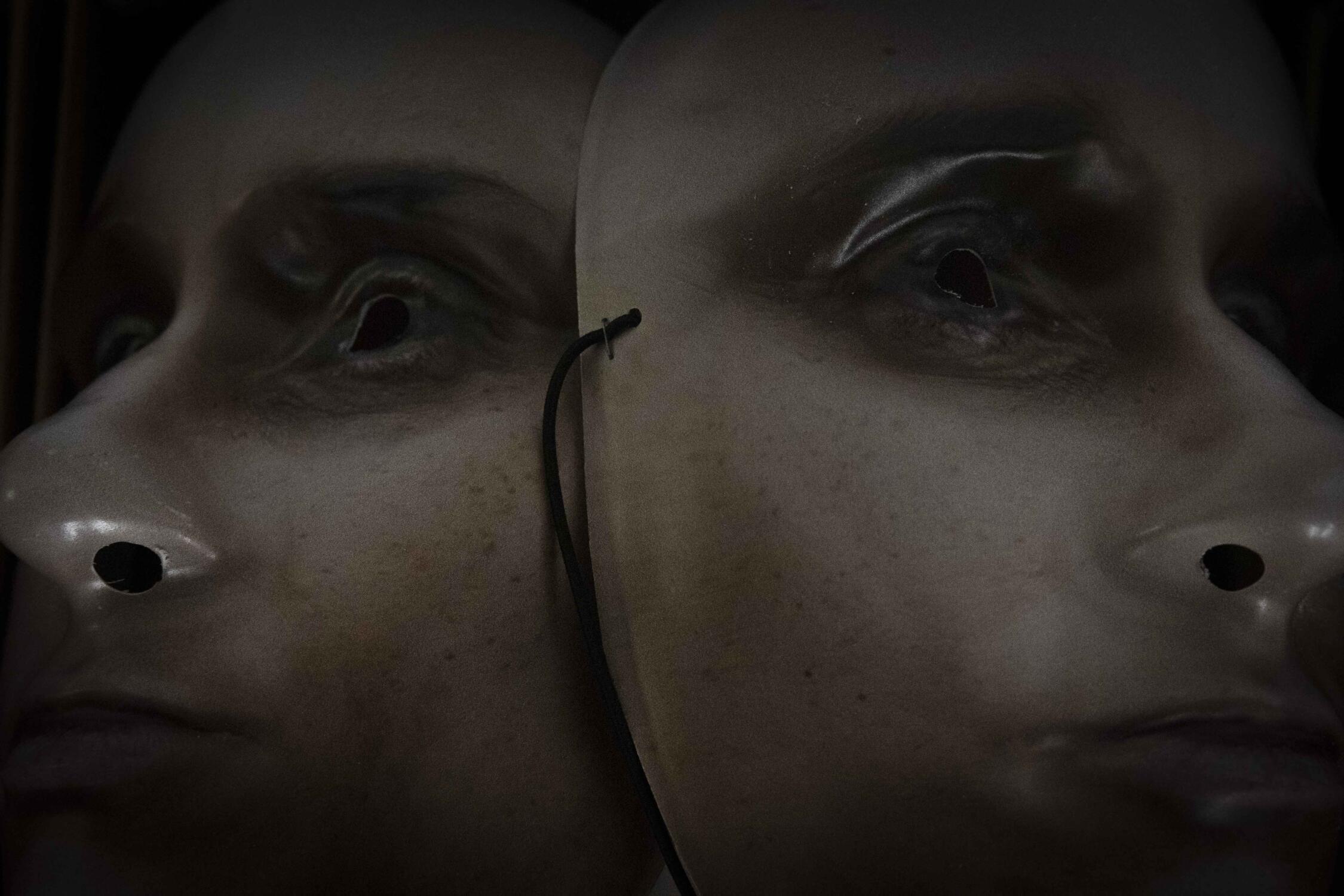 As audience members entered the theatre to see Believing in Masks, an attendant gave them a mask, with strict instructions to wear it for the entire show. About forty audience members were shown into what was a large, anonymous, brightly-lit room in the Triennale Gallery, taking their seats on wooden benches positioned on three sides. I found myself staring at the people sitting opposite me, each of them, wearing a rigid full-face mask. Old and young looked back at me. I had been given an old man’s mask, which felt uncomfortable since it made breathing difficult and restricted what I could see.