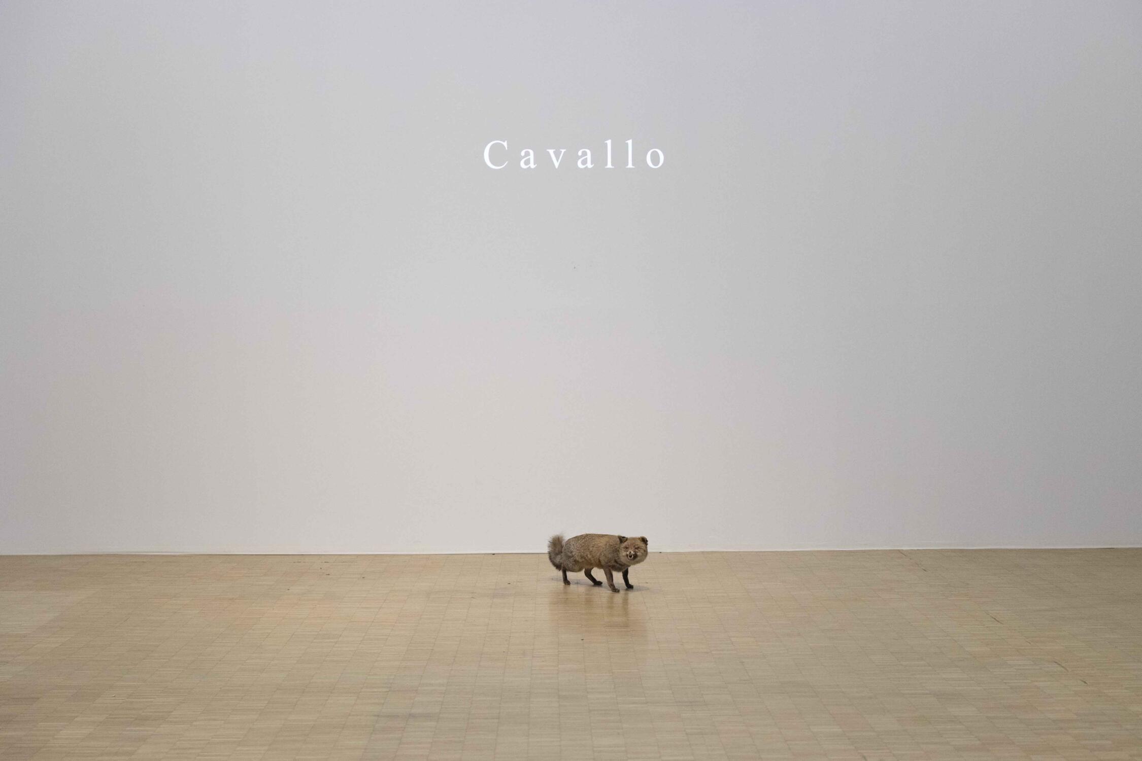 After we had settled down, two well-dressed men in masks began bringing boxes into the room. With each entrance, they opened a box and put an object on display – an ancient Greek vase, a bottle of milk, which one of them poured into a glass, an embalmed beaver – at least I think that’s what it was. Simultaneously, on the empty wall behind the objects, a word, totally unrelated to the object, was projected. For the Greek vase, the word ‘pipe’ appeared, for the beaver, the word ‘horse’. This discordance created a sense of chaos, nonsense, curiosity as to what was happening. René Magritte’s surrealist painting, Ceci n’est pas une pipe, sprang to my mind, which likewise disrupts the connection between words and their visual representations, albeit through negation.